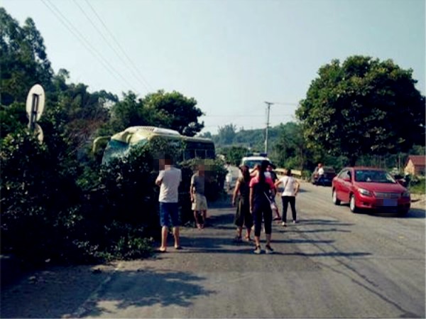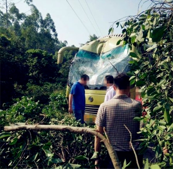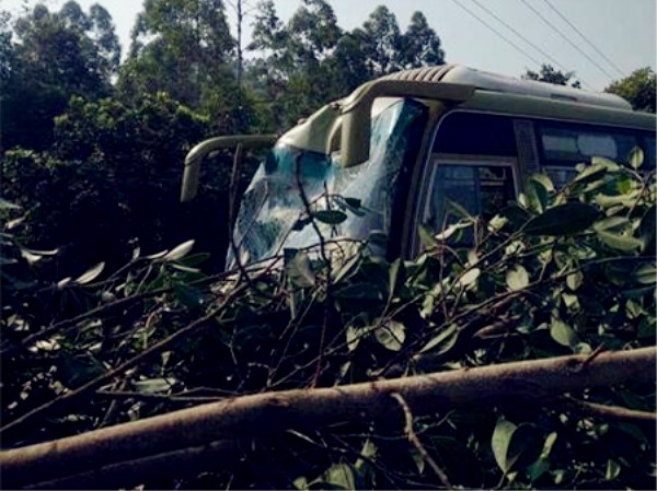 大客车突然冲向路沿 车头凹陷车身被树枝包围