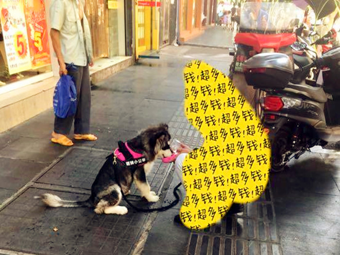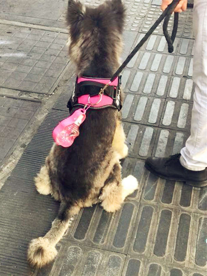 在这只宠物狗身上,在颈部除了有捆绑牵引绳的脖环外,还看到在牵引绳的扣环处,还扣着一个粉色的水壶,看上去充满着浓浓的少女心。“可能这只宠物狗是个妹妹吧,主人才想到用粉色的系绳。”目击市民说,“我当时还在想,这只宠物狗这么乖的吗,还给主人带水壶。”