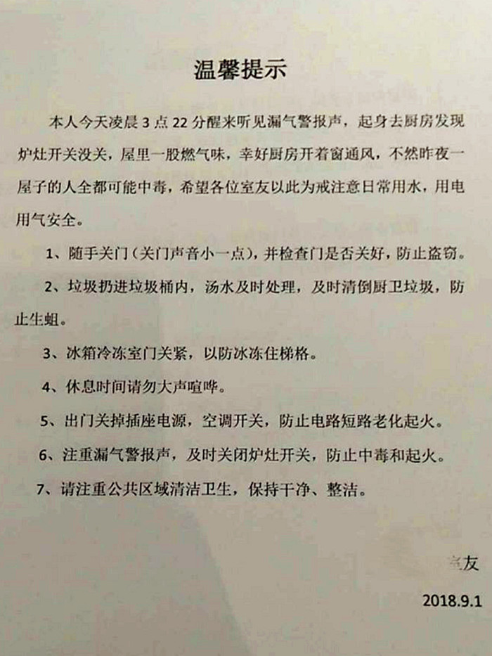 温馨提示中写着:本人今天凌晨3点22分醒来听见漏气警报声,起身去厨房发现炉灶开关没关,屋里一股燃气味,幸好厨房开着窗通风,不然昨夜一屋子的人全都可能中毒,希望各位室友以此为戒注意日常用水,用电用气氛安全。并细致列举了7大注意事项,可以说是非常全面了。