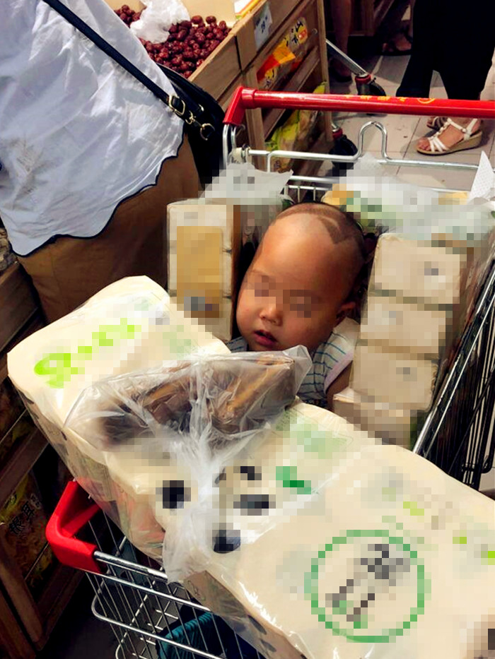 发布时间:2018-09-09 12:14:532018年9月2日,重庆万州。有市民在一家大型超市抢购商品时,突然看到一个圆乎乎的娃,被装在购物车里,被卷纸抽纸包围着,而这个萌娃已经进入梦乡了。