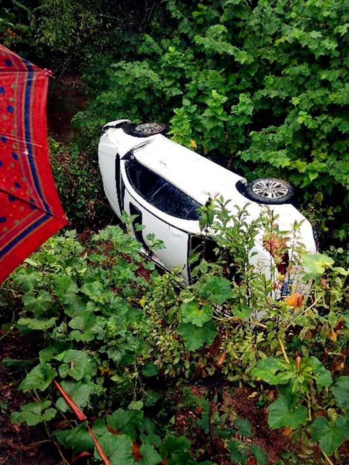 白色小车刚好侧翻90度直角,稳稳的立在了道路外的草丛中,“本来下着雨,这辆车又要超车,看到前方来车了,就开始猛打方向盘,紧接着就冲出道路翻在路边草堆里了。”