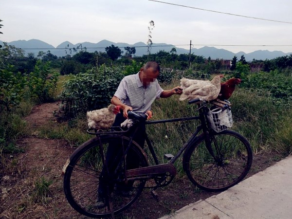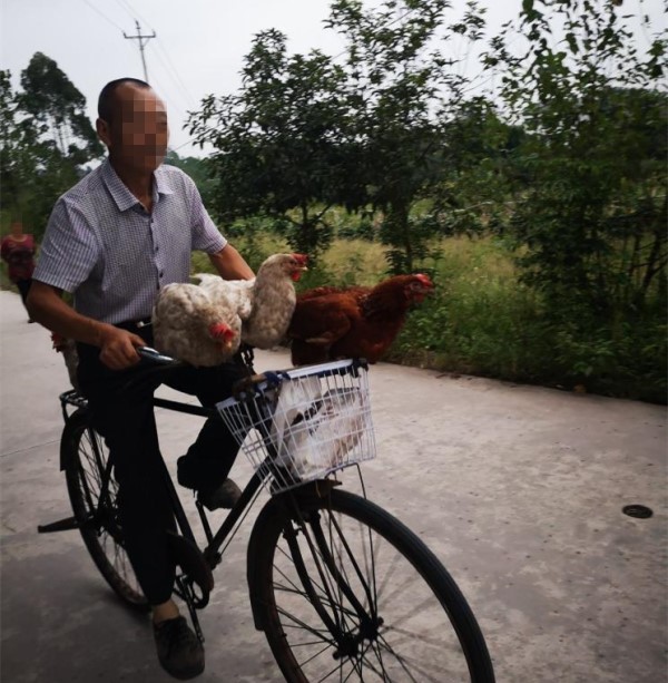 大爷骑着单车载着鸡兜风 没绑绳子不怕逃走