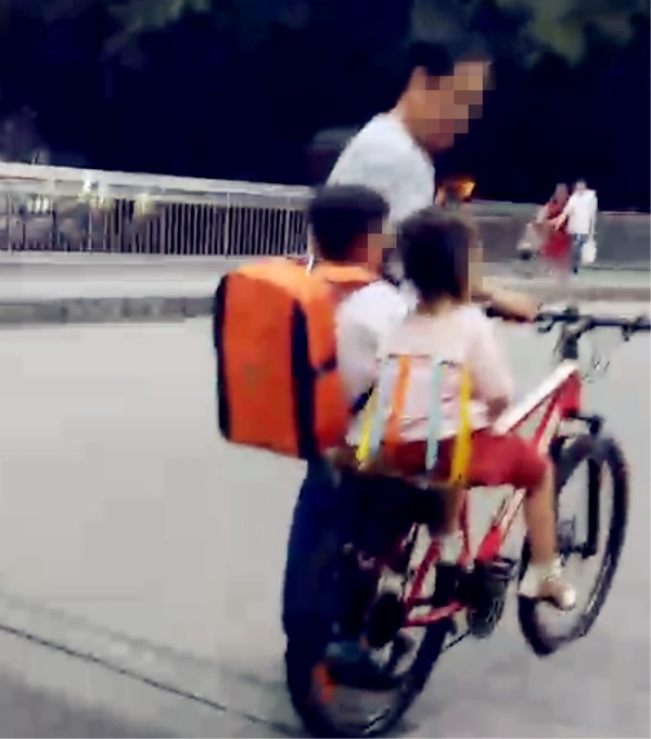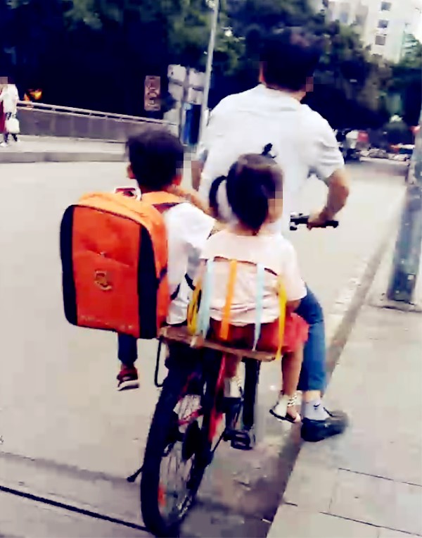 男子骑单车载着两小孩上路 路人为此感到担忧
