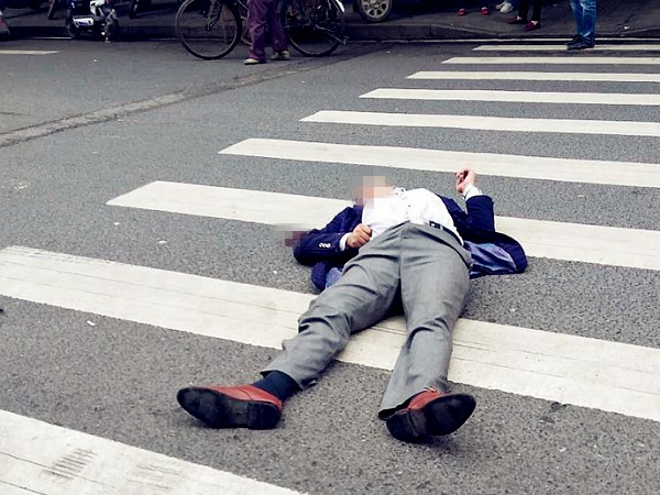 只见这名男子躺在斑马线上,右手握拳捂住肚子,左手则高高举着,同时也引起了许多过往路人的注意。