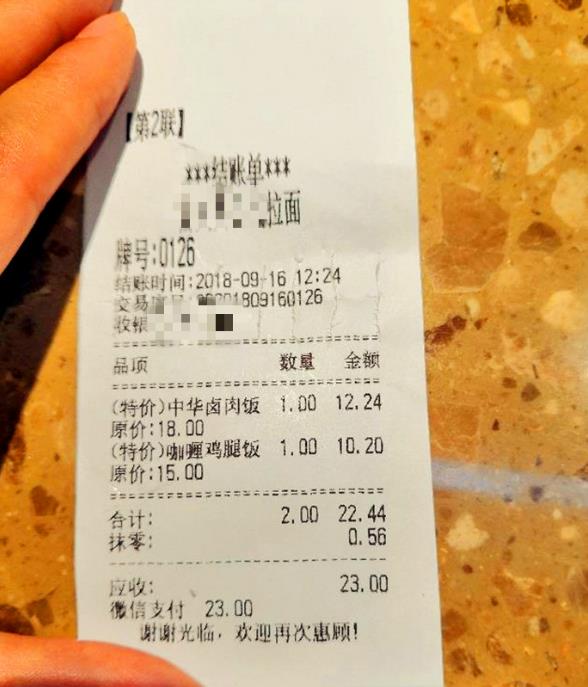 市民看到账单上的内容十分不解,“我今天在名扬吃饭,吃完看到单子上的价格有些问题,收费那里明显不对,”他语气有些气愤,“还是第一次晓得抹零不是四舍五入,反而往多了加,打不打折无所谓,但是多收就有点说不过去了。”