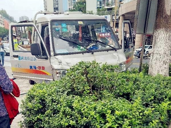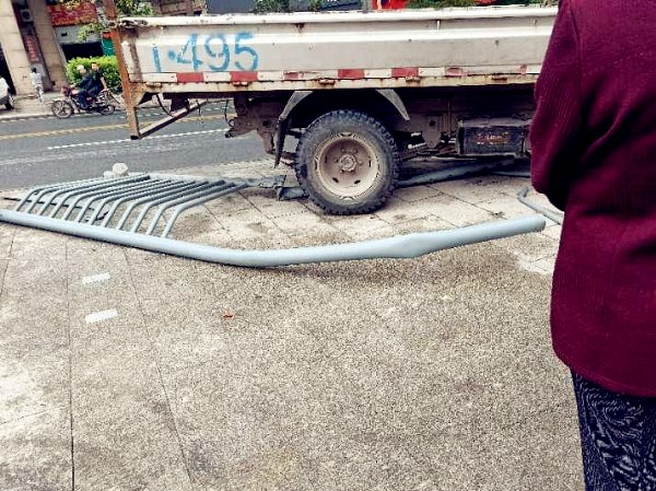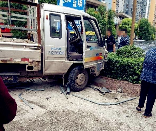 小货车撞坏路边护栏 突然冲上了人行道