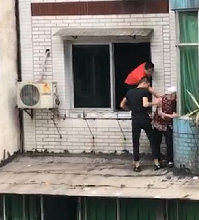 2018年9月20日。重庆忠县。一名香山社区的网格员发现有位老太太被困窗外,情况非常危险,立马联系社区工作人员合力解救。