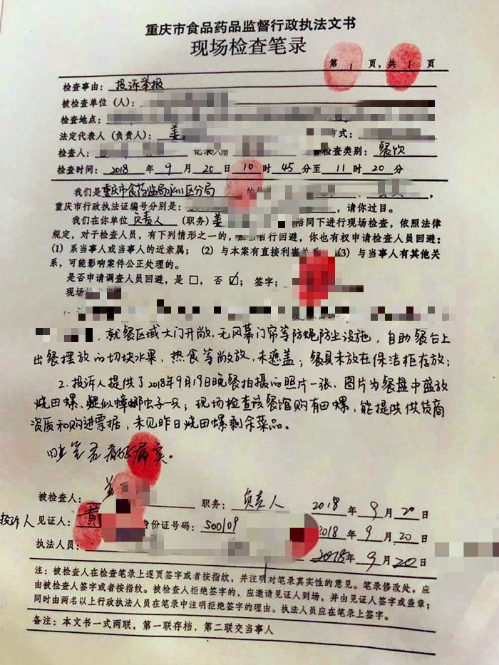 2018年9月20日,黄女士陪同执法人员对事发餐厅进行了检查。从黄女士提供的一份《重庆市食品药品监督行政执法文书现场检查笔录》可以看到,执法人员观察到“就餐区域大门开敞,无风幕门帘等防蝇防尘设施,自助餐台上出餐摆放的切块水果、热食等敞放,未遮盖;餐具未放在保洁柜存放。”