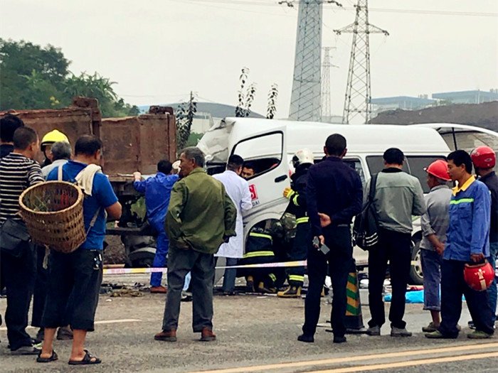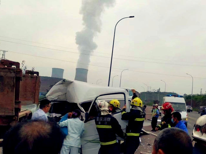 发布时间:2018-09-23 16:06:052018年9月22日,重庆綦江。有市民在北渡电铝厂附近,看到一辆面包车与一辆货车相撞,面包车车头凹陷得厉害,地面散落着白色的车身残片。