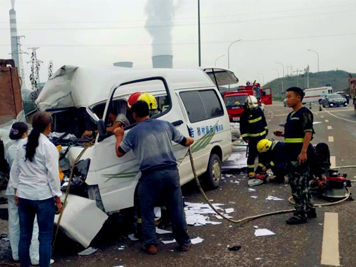 面包车撞上货车 残片满地司机被困驾驶室