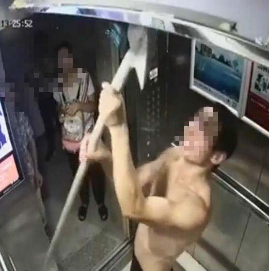 几分钟后,在装修工将木板往外运的时候,电梯顶棚又完全掉了下来。