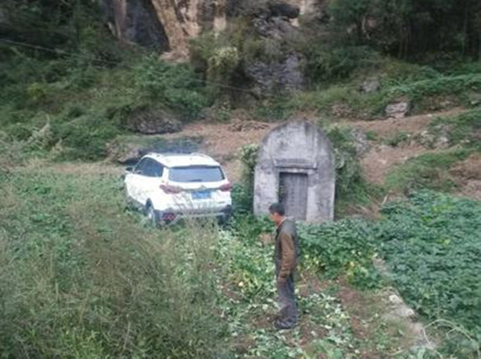 从目击市民提供的照片可以看到,白色的轿车开进农田停在了一座坟墓旁边,车身上面还有一些杂草挂在上面,模样十分狼狈。