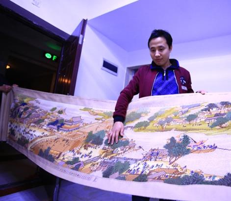 在一幅长6.52米,宽0.7米的绣布上,550多个各色人物,50多匹牛、马、骡子等牲畜,20多艘大小船只,房屋若干……这栩栩如生的画面,并不是出自绣娘,而是“绣男”邹强一针一线,用四年的时间,精心绣制而成的《清明上河图》。