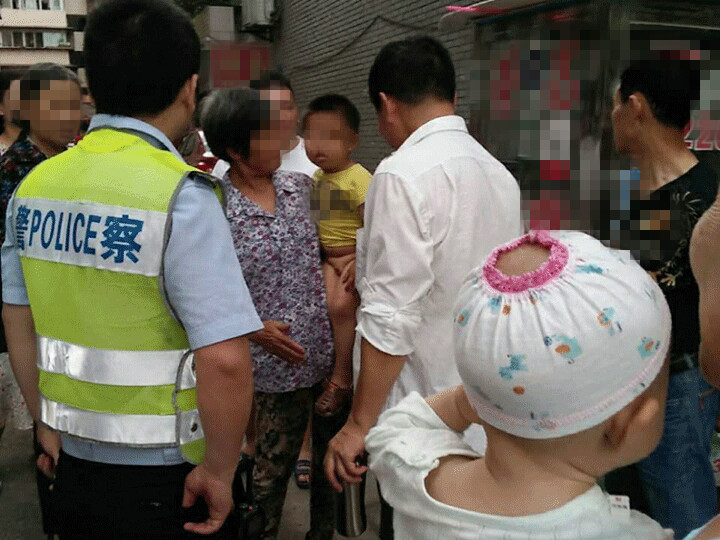 众人在小区周围找了一会儿,就看见民警抱着孩子出现了。因民警事先问过男孩家人的名字,而老太说的名字也和男孩说的名字对得上,民警于是把孩子交给老太。