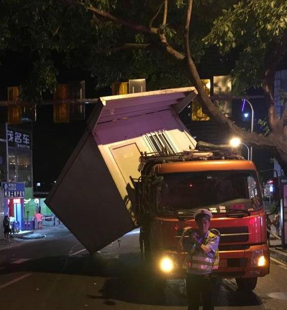 7月22日晚上,货车驾驶员张某驾驶这辆大车从小什字往解放碑方向行驶,路过苍白路洪崖洞红绿灯处时,车上的板房与左侧人行道上的行道树发生了擦挂。正当张某察觉不对劲打算停车查看时,就听到“砰”的一声,移动板房向右滑落,重重的砸在马路上,只有一小部分还挂在货车上。 事故造成两条车道被占据。