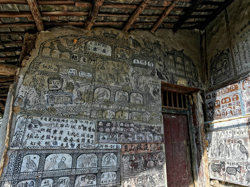 老人说:“自己的爷爷是私塾太师爷,小时候听过的故事怕以后忘了,脑壳一发热就开始画,一画好多年,满土屋都是。”