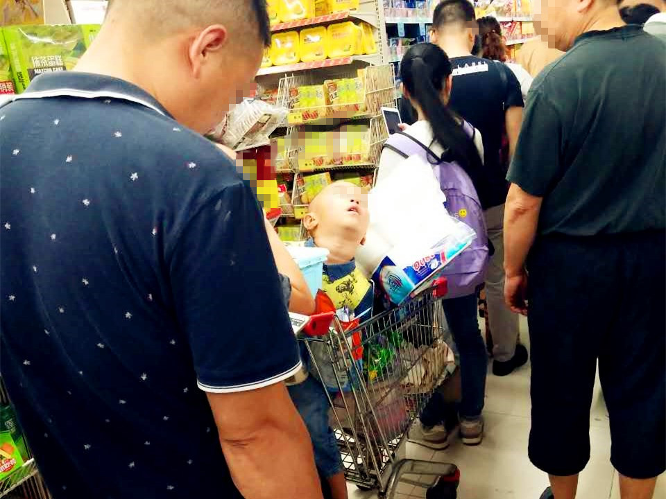 全市多地超市打拥堂 萌娃购物车里入梦乡