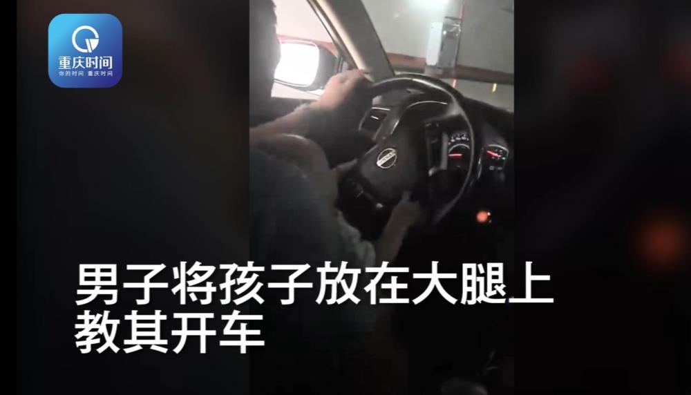 通过视频可以看到,一位男子将一小孩环抱在方向盘前方,垫在自己大腿上,正在教小孩开车,而小孩摇摇晃晃,看上去站都站不稳。