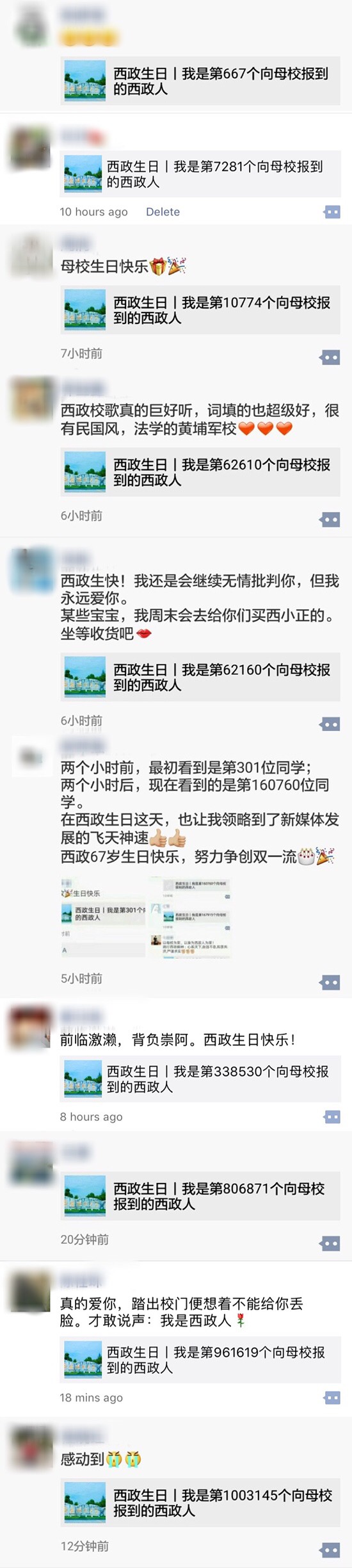 昨天,9月19日,由西南政法大学民商法学院新媒体中心发起的“西政生日——我是第xxx个向母校报道的西政人”活动,刷爆了法律人的朋友圈。从早上8点到中午12点,短短的4个多小时,接力人数已超过50万,截至到晚8点,总的接力人数已超过100万大关。