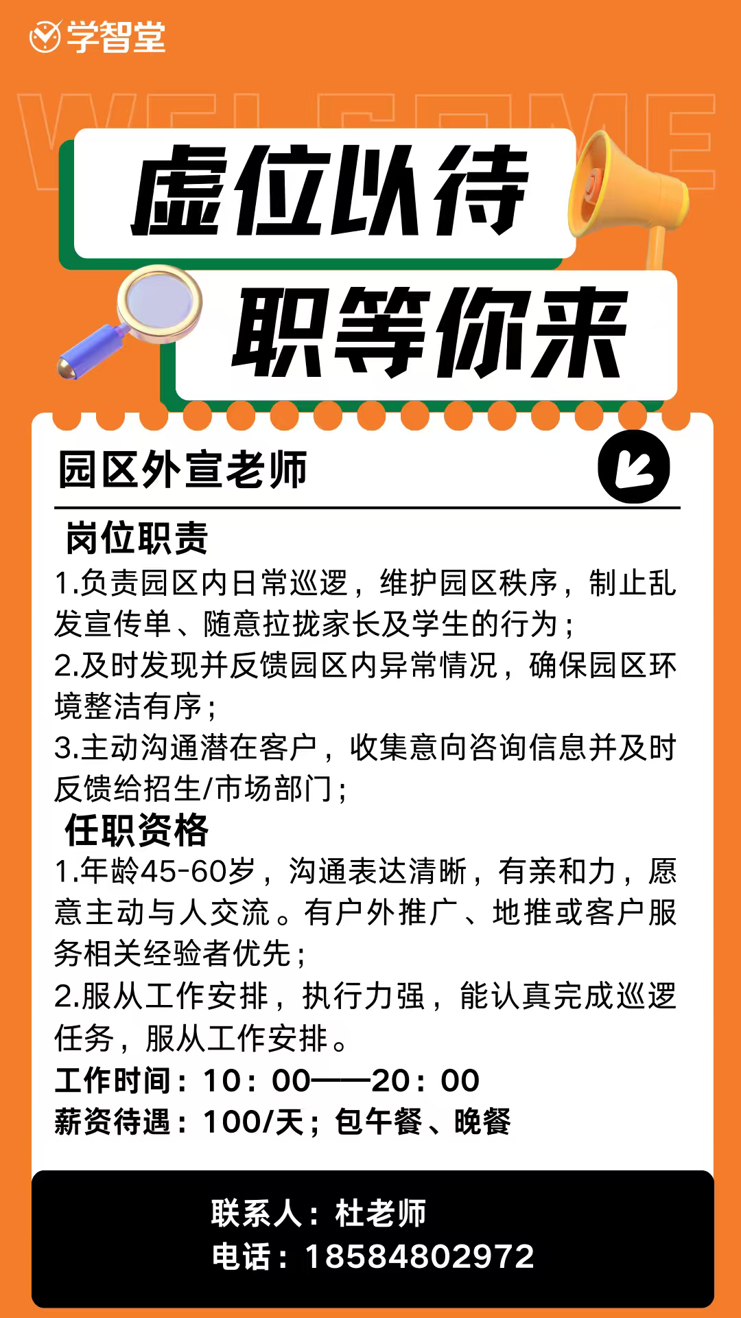 1.年龄45-60岁,沟通表达清晰,有亲和力,愿意主动与人交流。有户外推广、地推或客户服务相关经验者优先;