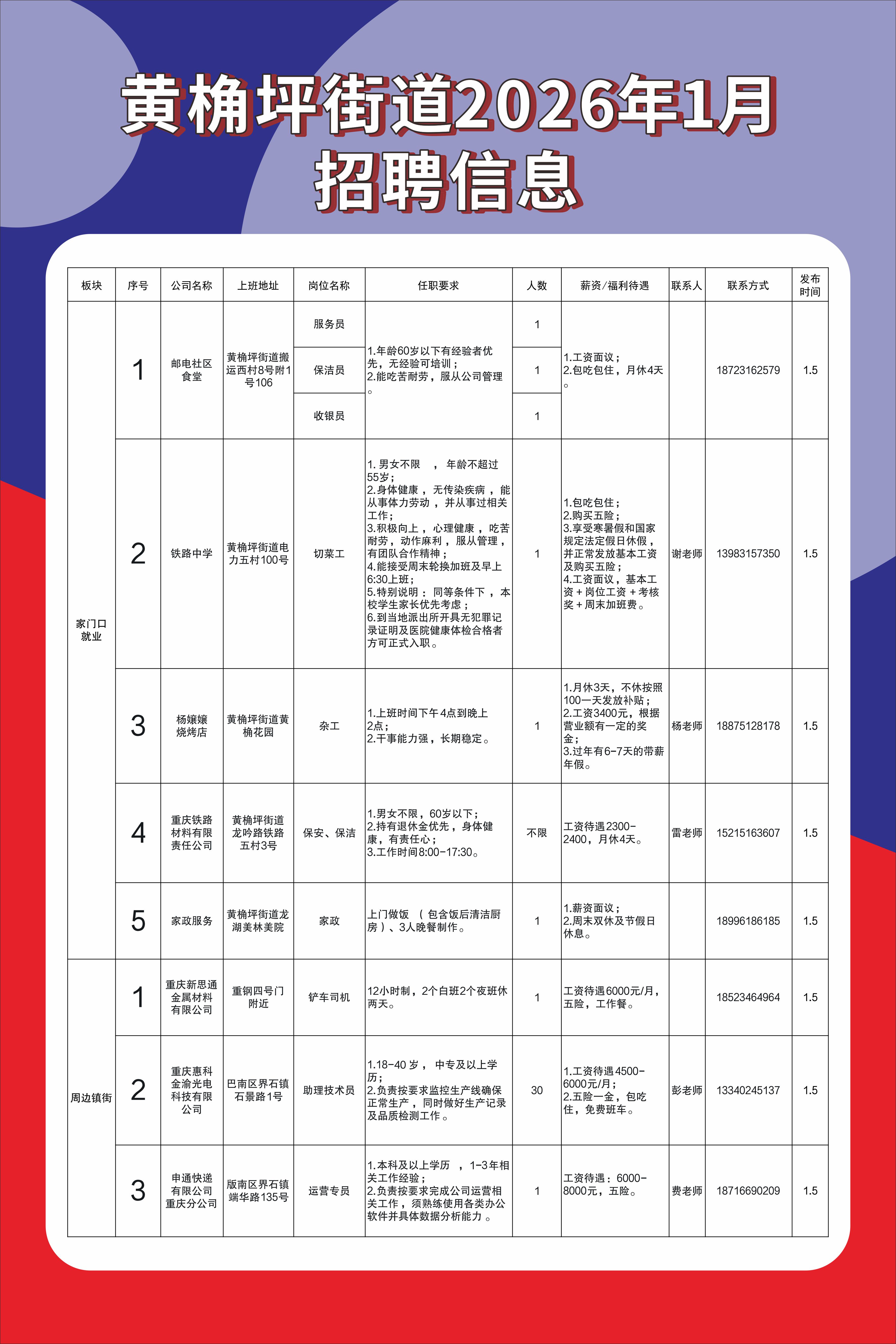就业驿站 | 黄桷坪街道2026年1月招聘信息