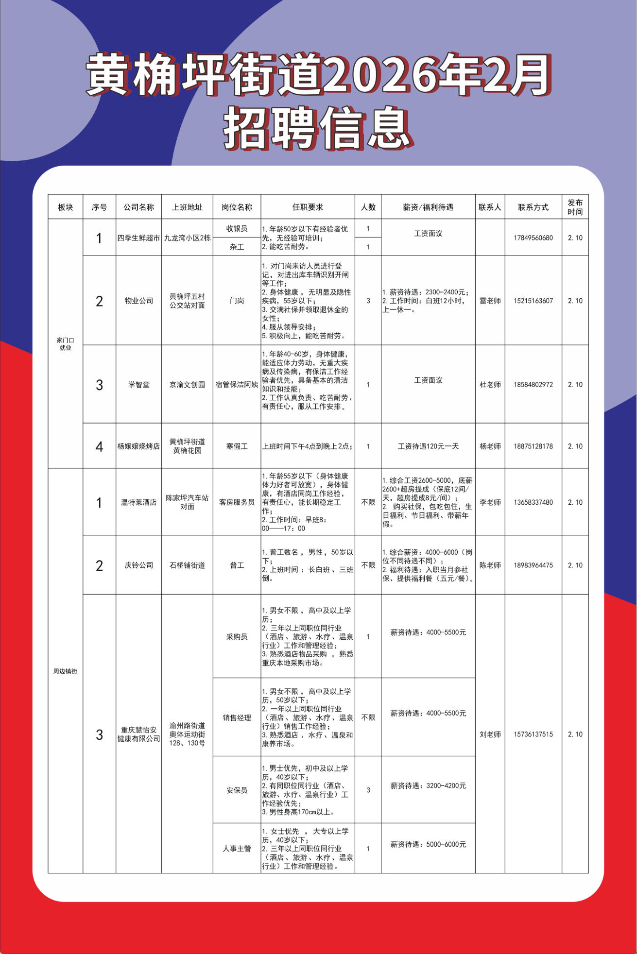 就业驿站 | 黄桷坪街道2026年2月招聘信息